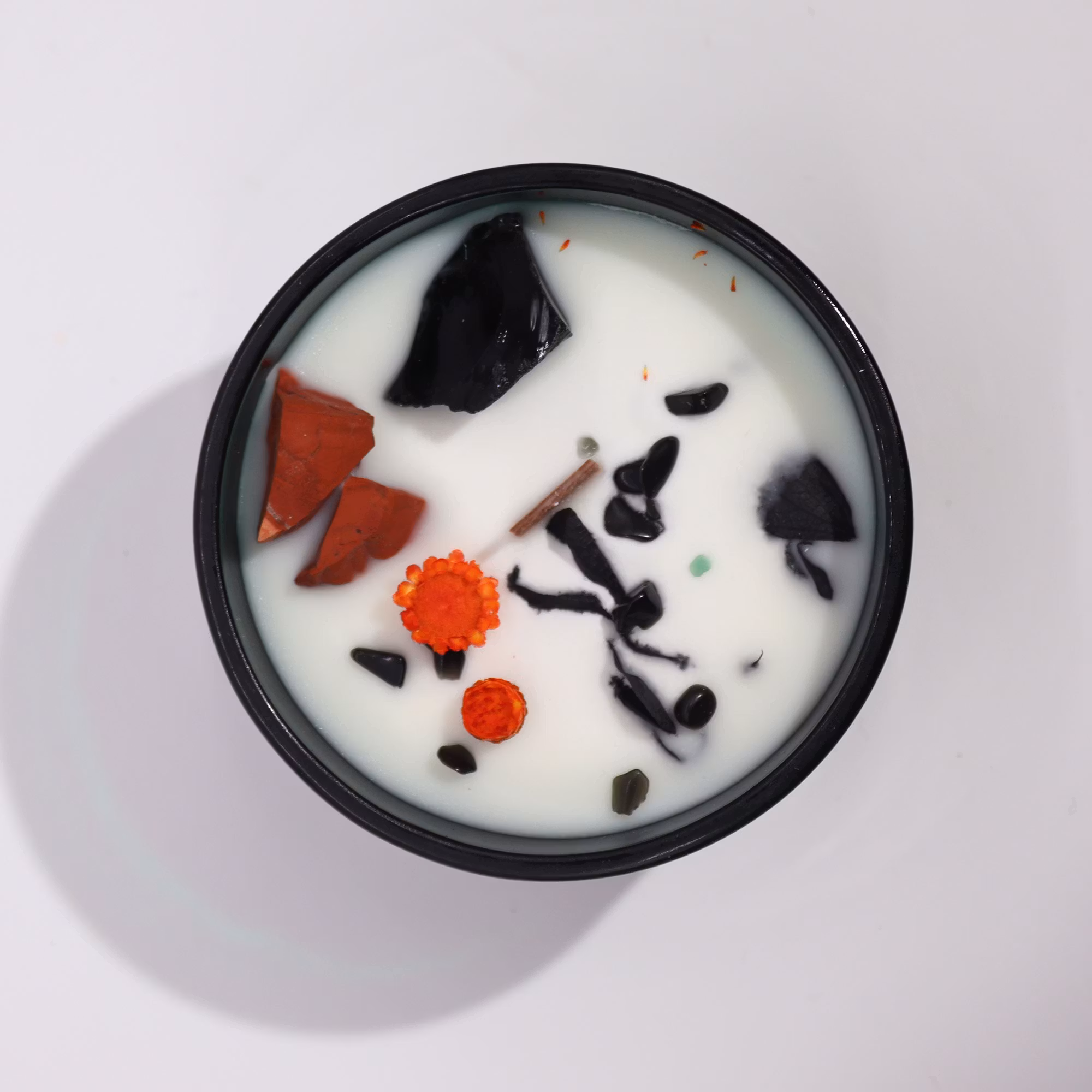 Vidunderligt duftlys i glas lavet af sojavoks med trævægge, rød jaspis og sort agat.