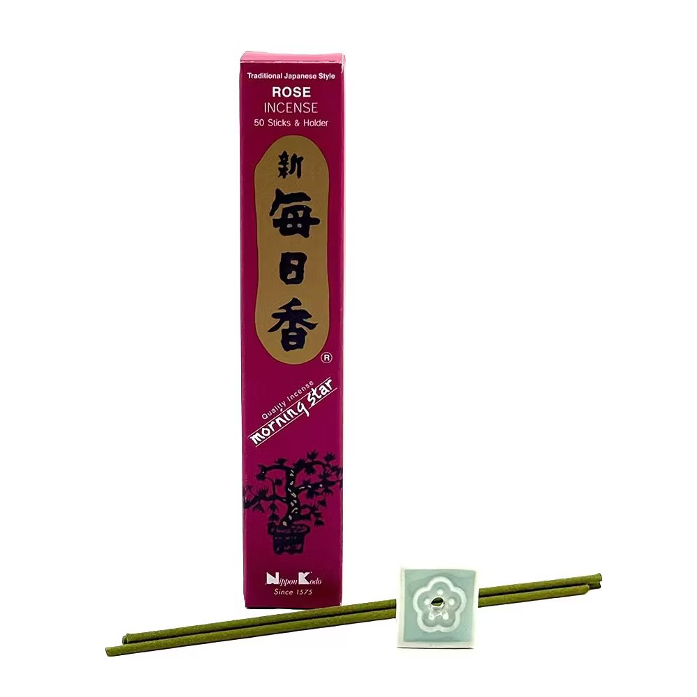 Japansk røgelse. Pakken indeholder 20 g (50 pinde) og en lille keramikholder. Brændetid cirka 25 min.