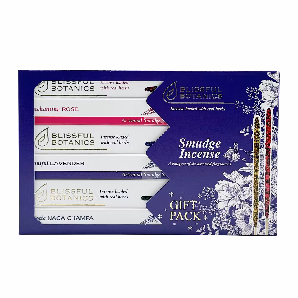 Smuk gaveæske med røgelse. Indeholder 6 pakker med de klassiske dufte fra Blissful Botanicals sortiment.