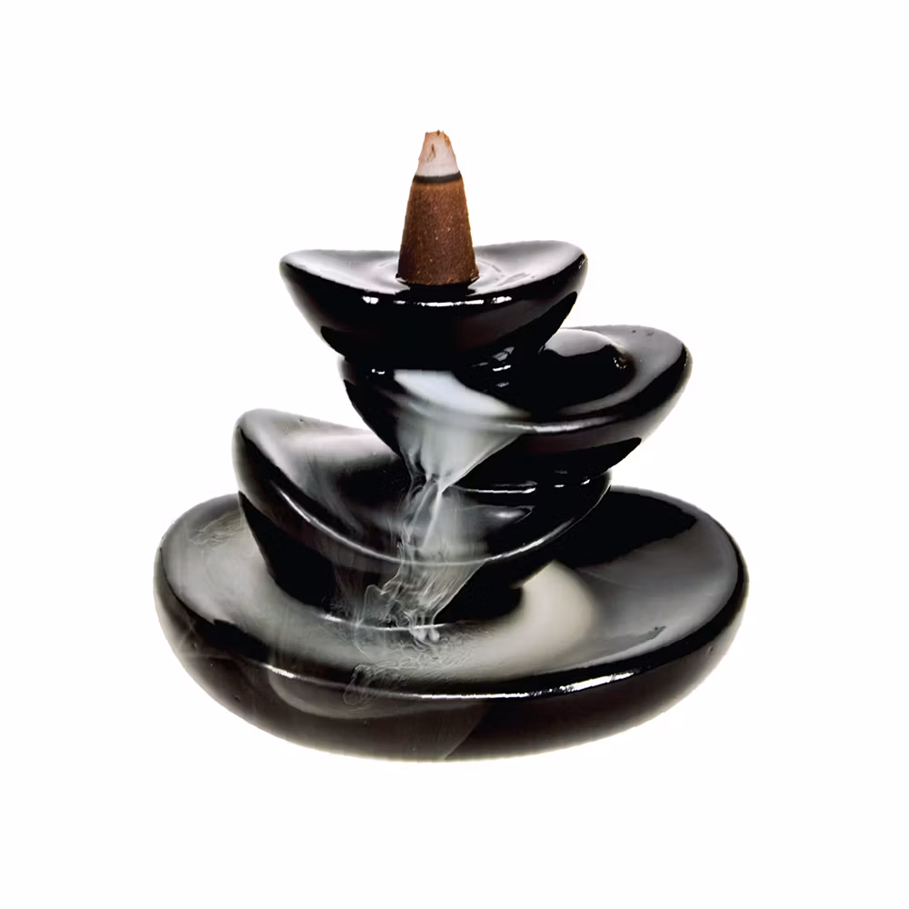 Sort backflow røgelsesbrænder er designet til at skabe et dramatisk flow af røg, som løber ned ad tårnet og samler sig i skålen nedenfor (som vist på billedet).
