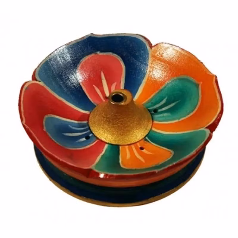 Lotus i laktræ, FlerfarvetRøgelsesholder rundRøgelsesholderen har et større hul i midten til røgelse uden bambuspinne samt flere små huller til røgelse med bambuspinne. Passer til: